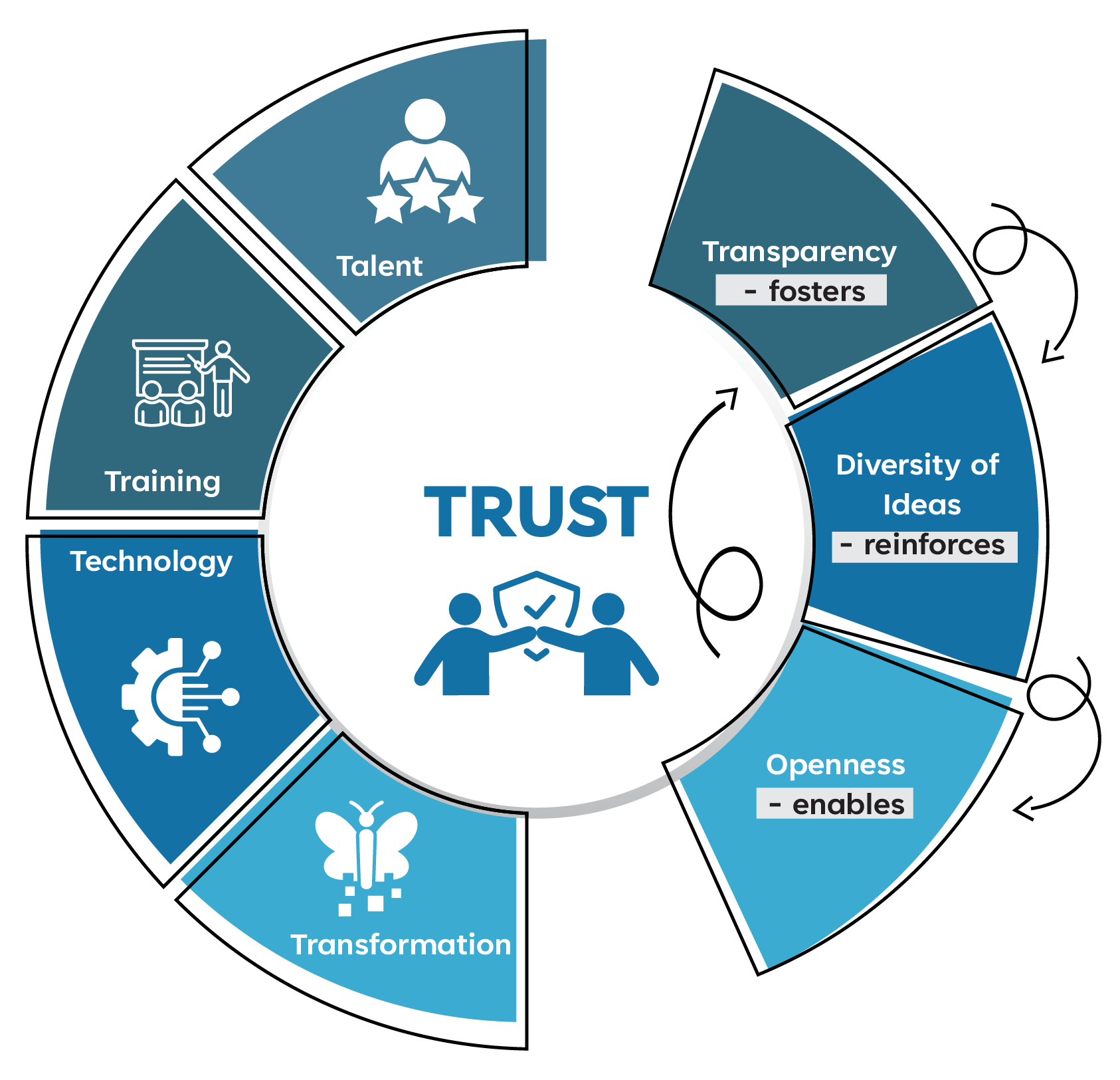 Trust improves organizational alignment and a sense of belonging. When employees trust their employers, they are much more likely to work together toward achieving set business goals. Employees are more likely to relate to these goals as they reflect their personal aspirations making them feel they are a part of the organization. We help the organization improve their trust coefficient through the 7 P model.